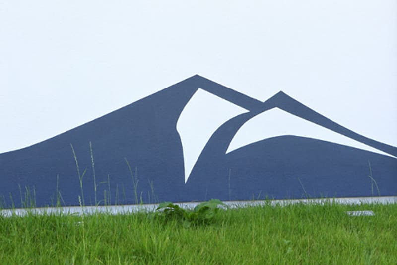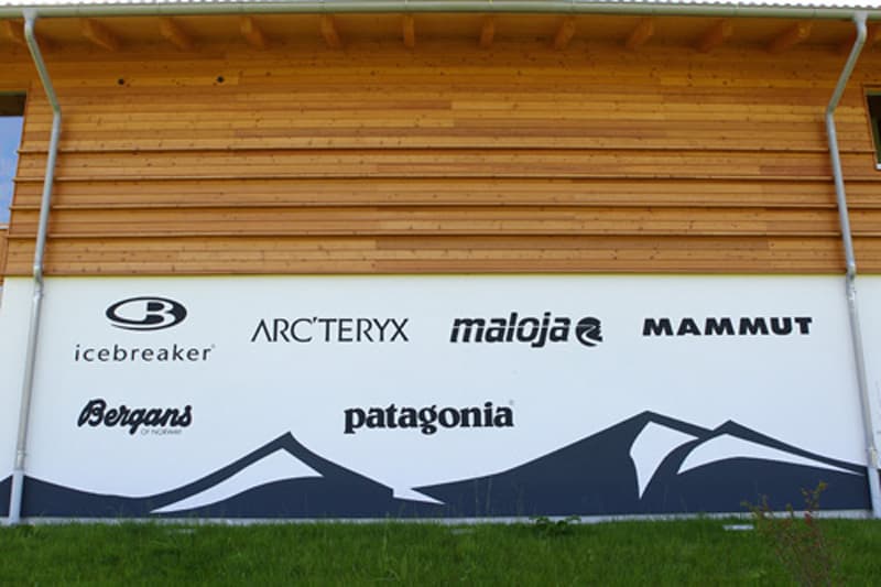 Outdoor-Bergzeit: Werbefassade mit Firmenlogos